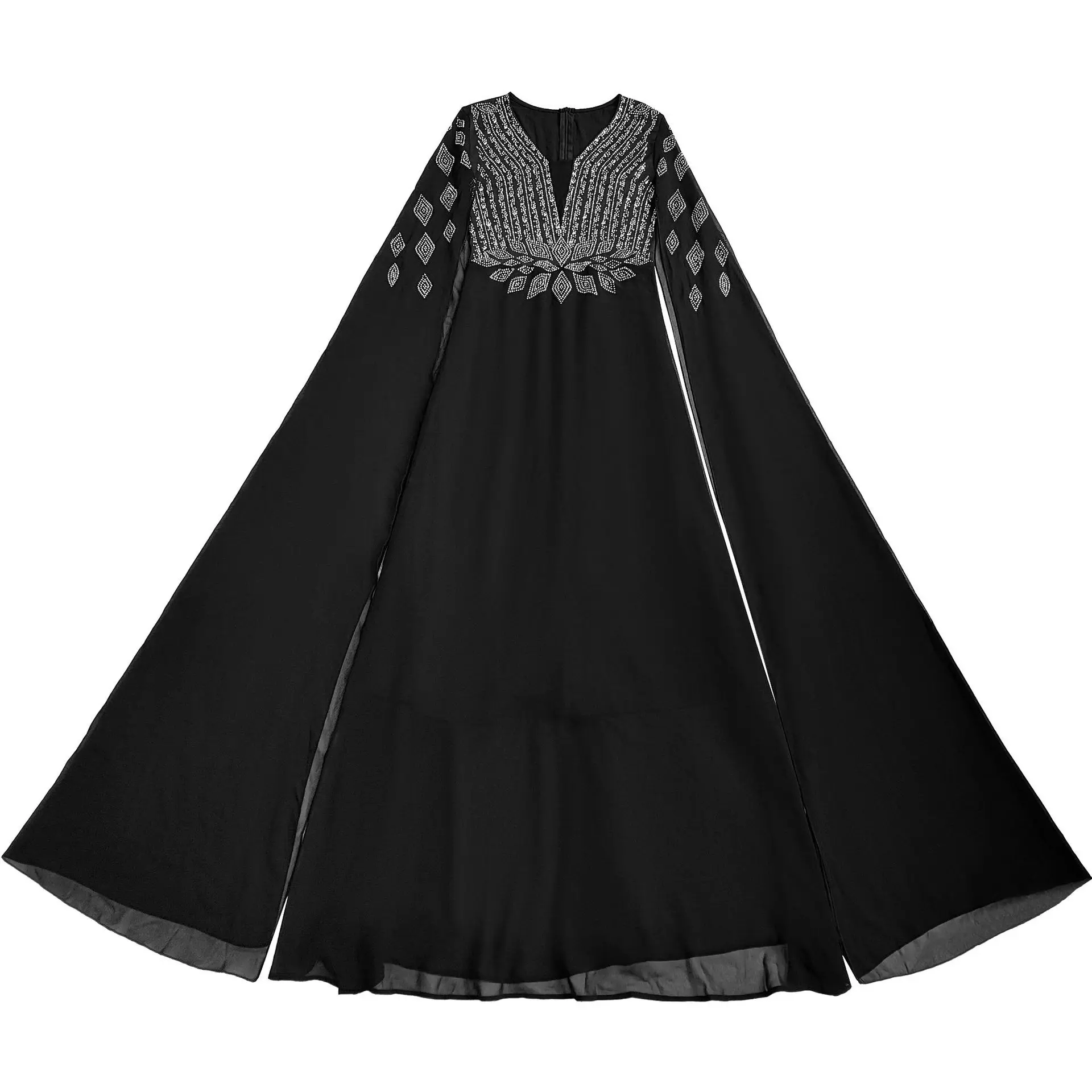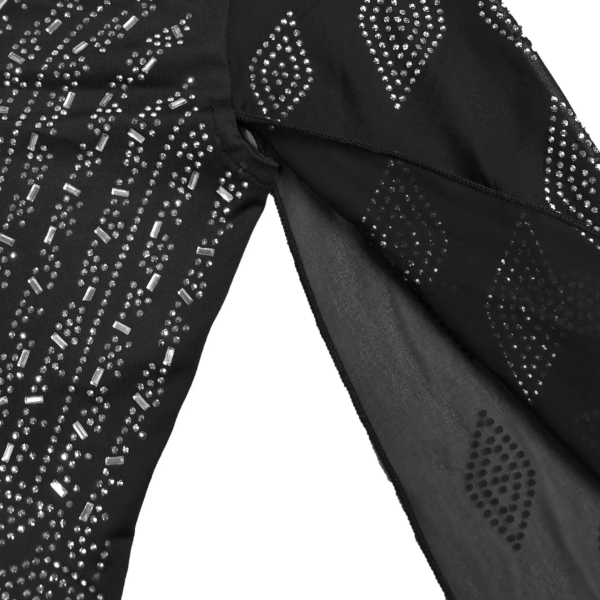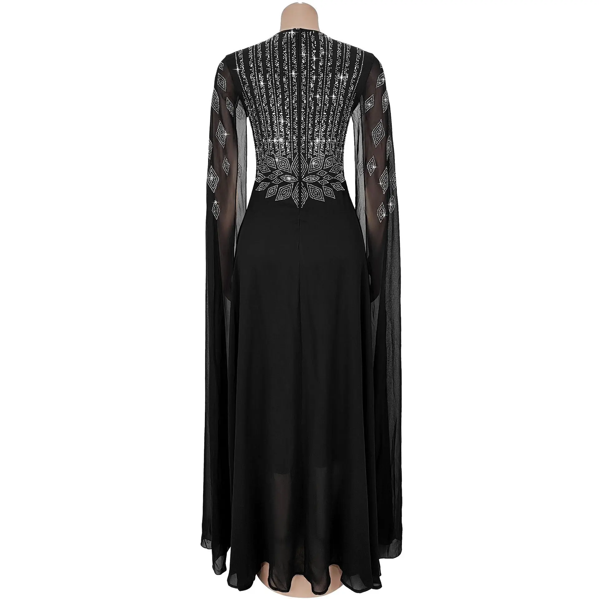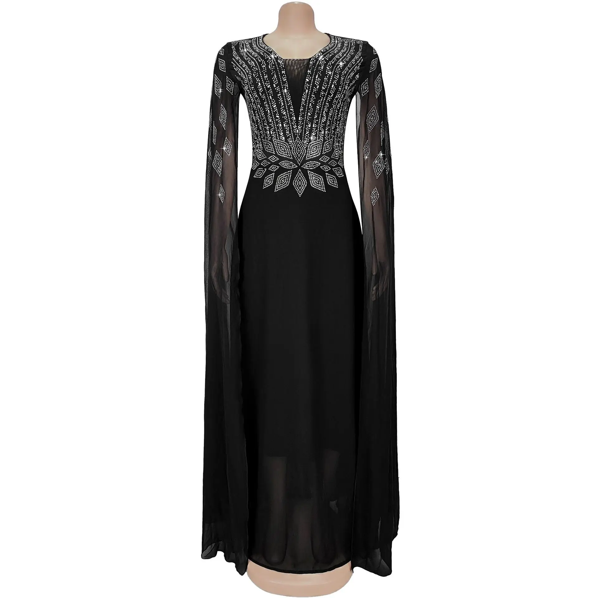 New Arrival Middle East Women Chiffon Maxi Dresses Sexy Solid Color Sheer Mesh Spliced Rhinestone Decor Floor Length Party Dress