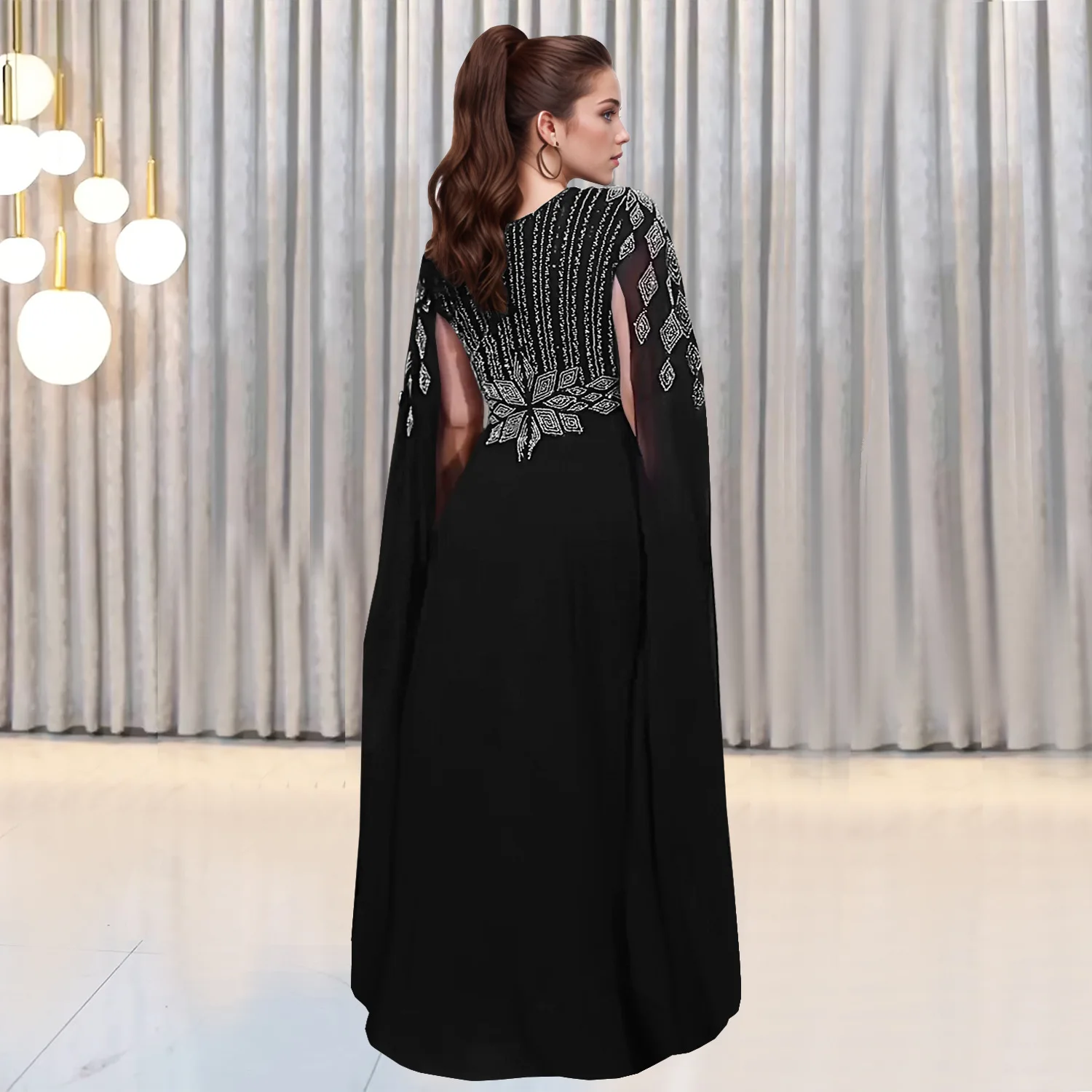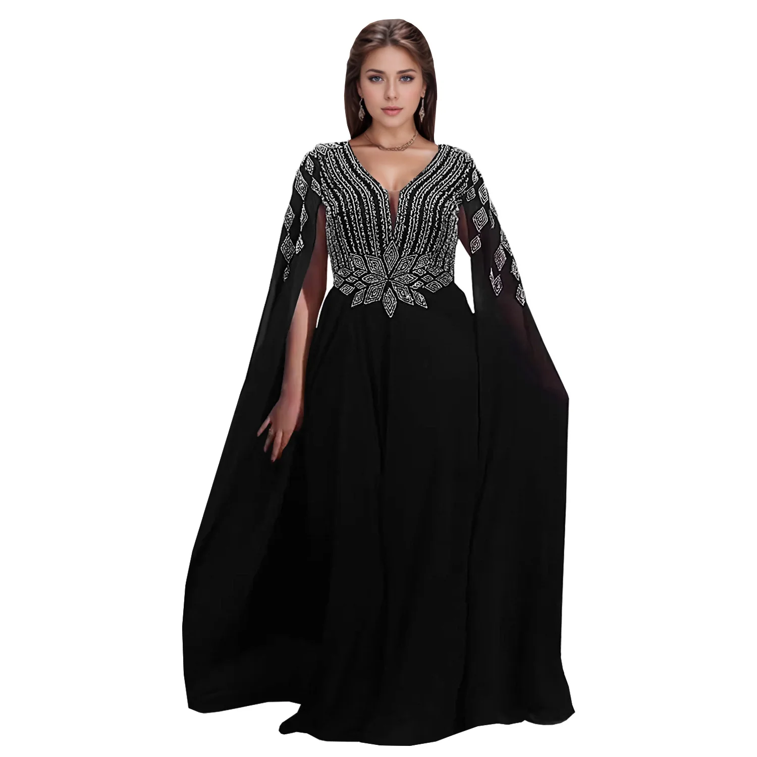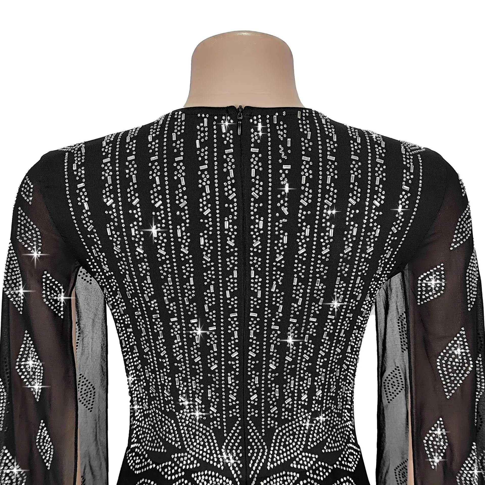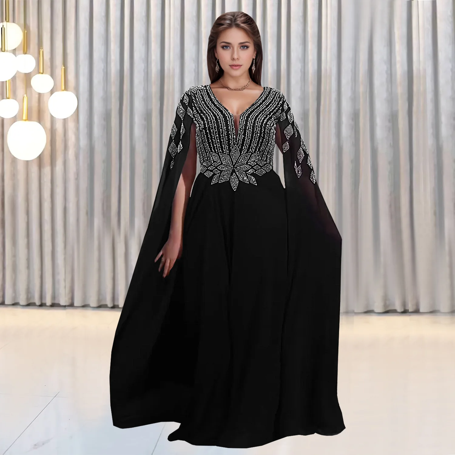 New Arrival Middle East Women Chiffon Maxi Dresses Sexy Solid Color Sheer Mesh Spliced Rhinestone Decor Floor Length Party Dress